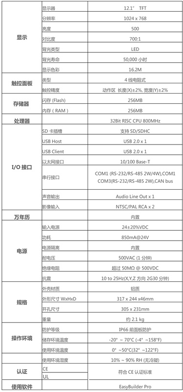 產品特點 Installation 鋁合金外殼搭配全新色彩與時尚設計 Video Input Ports 支持 NTSC 及 PAL 格式 12.1" 1024x768 TFT 工業級 LCD 無風扇冷卻系統 內置 256MB 儲存內存及萬年歷 NEMA4/IP66 面板防護等級 陶瓷封裝高壽命LED背光 SD 卡插槽支持 SD/SDHC 內置電源隔離防護器 Com1或Com3 RS485 2W 支持 MPI 187.5K CAN bus 裝置支持 CANopen 通訊協議 Com1 / Com3 RS485 及CAN bus 隔離器內置